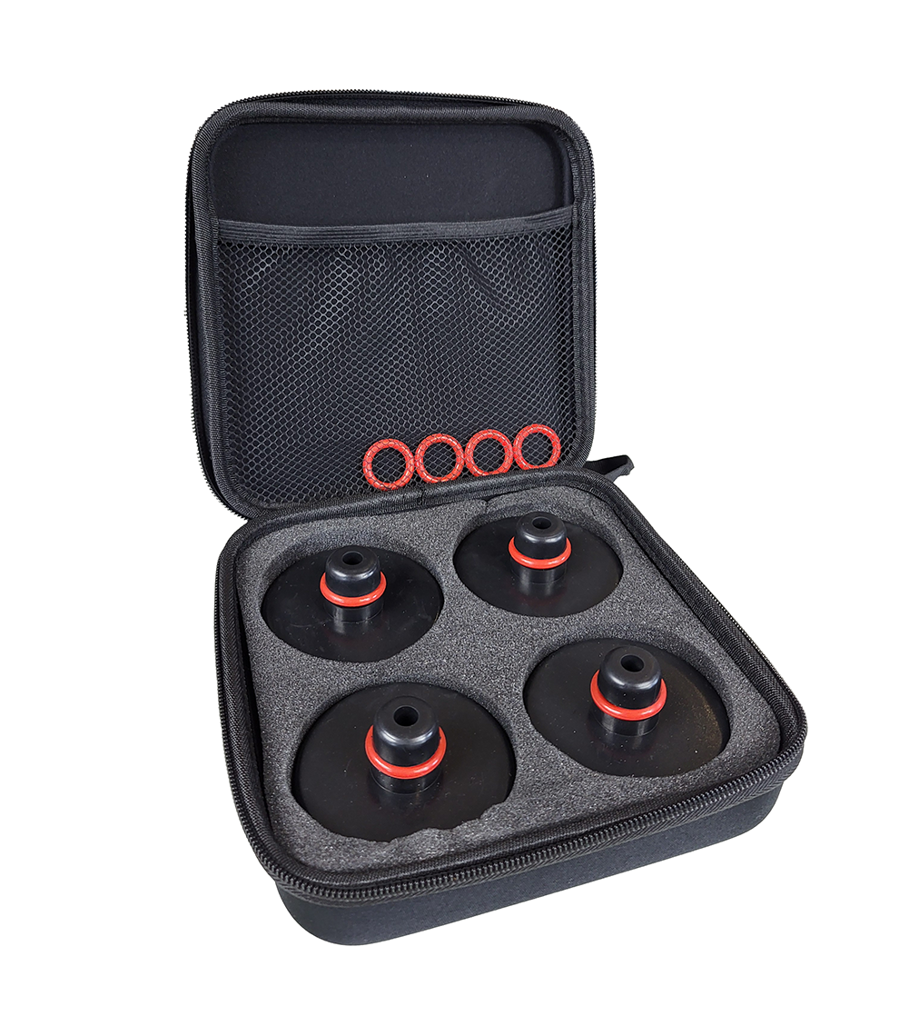 Zestaw zawiera 4 gumowe podkładki, 4 zapasowe oringi zabezpieczające oraz etui.