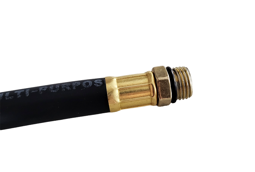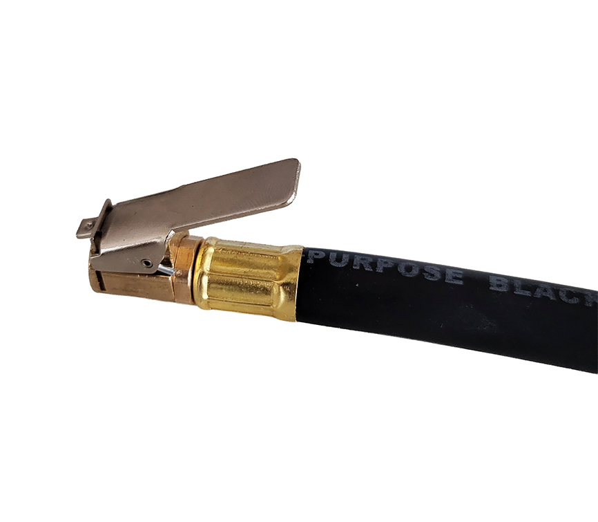 Wąż do pompowania kół z zakutą końcówką pasującą do standardowych wentyli samochodowych.
